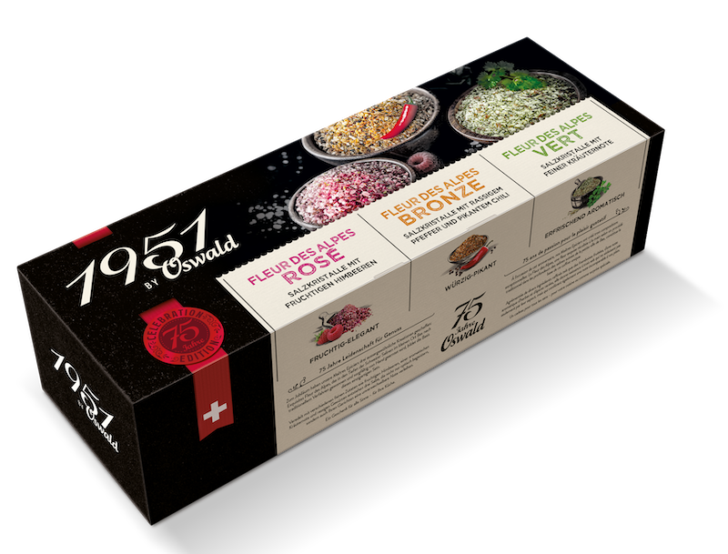 Zum 75-jährigen Jubiläum zelebriert Oswald die Kunst des feinen Geschmacks mit einer Kollektion, die Tradition und moderne Genusskultur auf stilvolle Weise vereint: «Fleur des Alpes» 1951. Die drei exklusive Premium-Salze wurden auf Basis von Schweizer Fleur des Alpes aus den historischen Salzminen von Bex kreiert. Die feinen Kristalle, reich an natürlichen Mineralien und mit zartem Crunch, werden sorgfältig von Hand geerntet und veredelt.