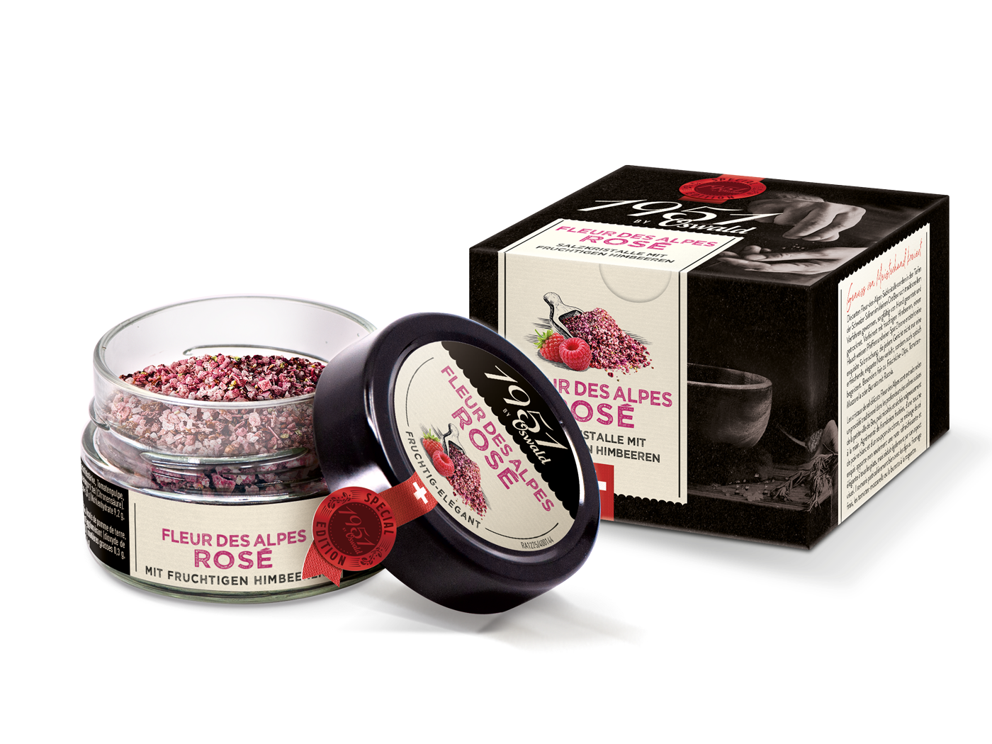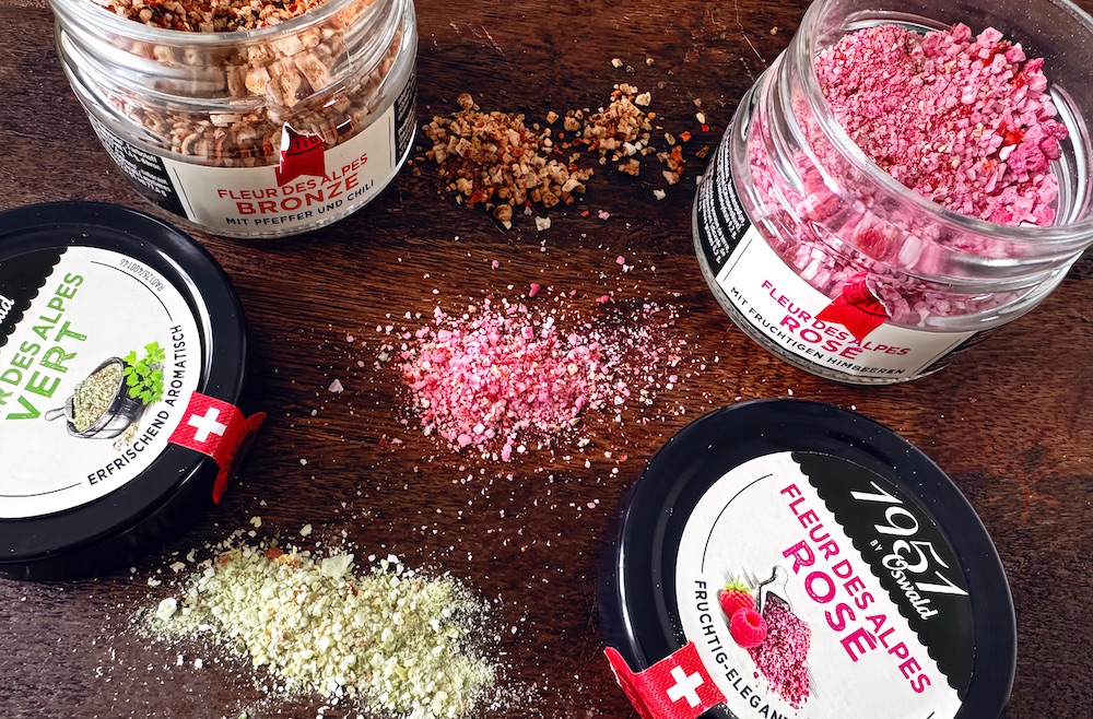 Ein Hauch von Himbeere, aromatische Kräuter, ein feiner Chili-Kick und darunter die pure Essenz der Schweizer Alpen: Zum 75. Jubiläum lanciert Oswald mit «Fleur des Alpes» 1951 drei luxuriöse Finishing-Salze, die Genuss in ein stilvolles Statement verwandeln und verschiedenste Gerichte perfekt vollenden.