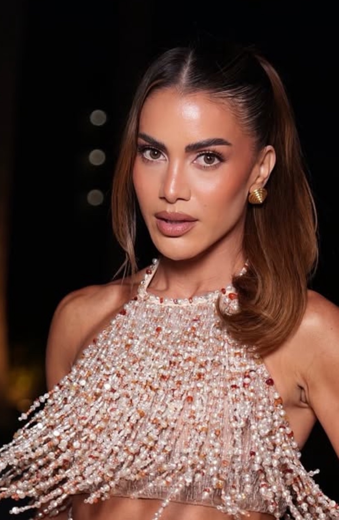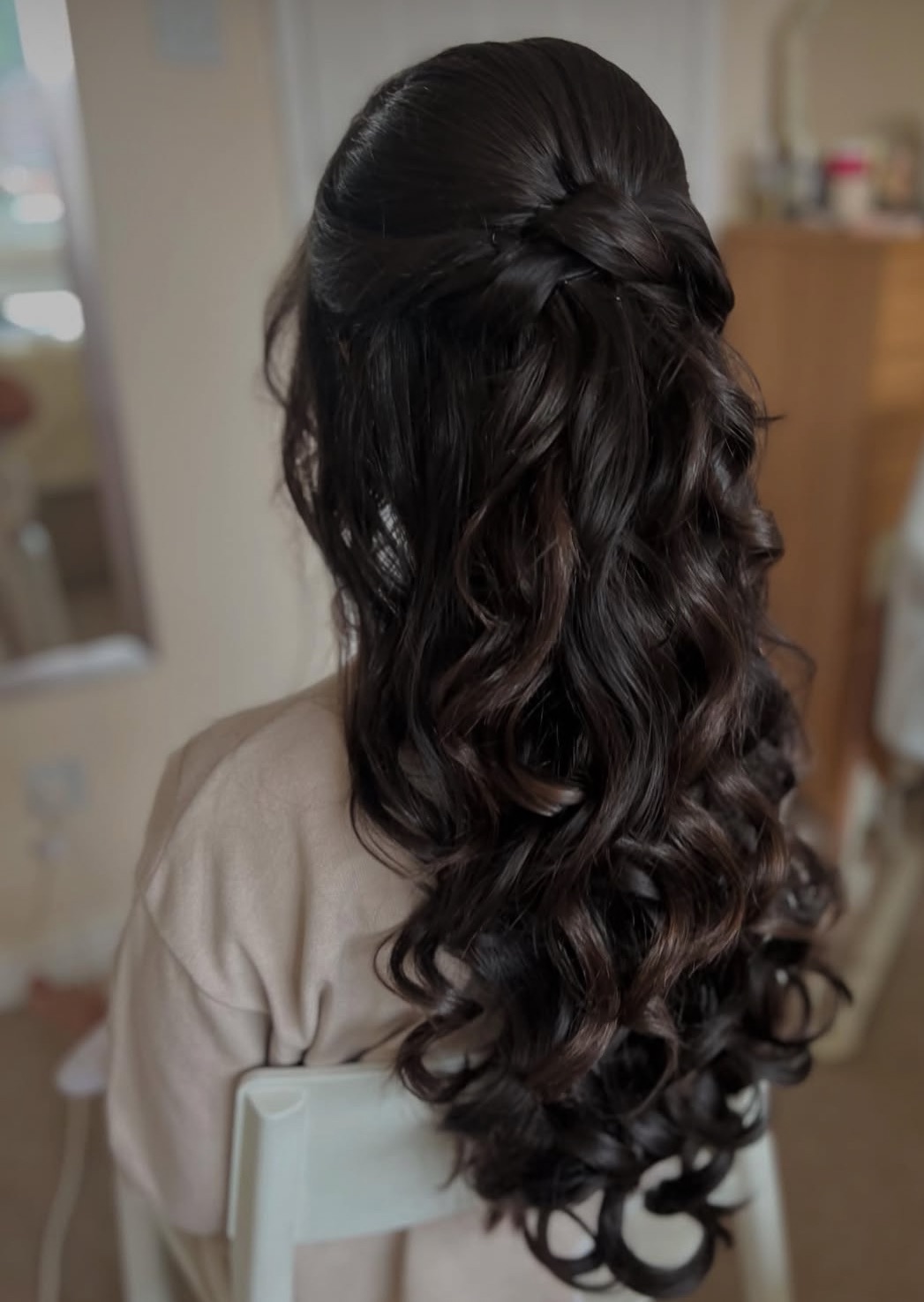 Dieser Look ist der Inbegriff moderner Festlichkeit: ein hochsitzender, voluminöser Ponytail mit sanft gewellten Spitzen und zwei Strähnen, die das Gesicht elegant umspielen. Die Kombination aus glattem Ansatz und luftigen Locken sorgt für eine perfekte Balance aus Glamour und Leichtigkeit.