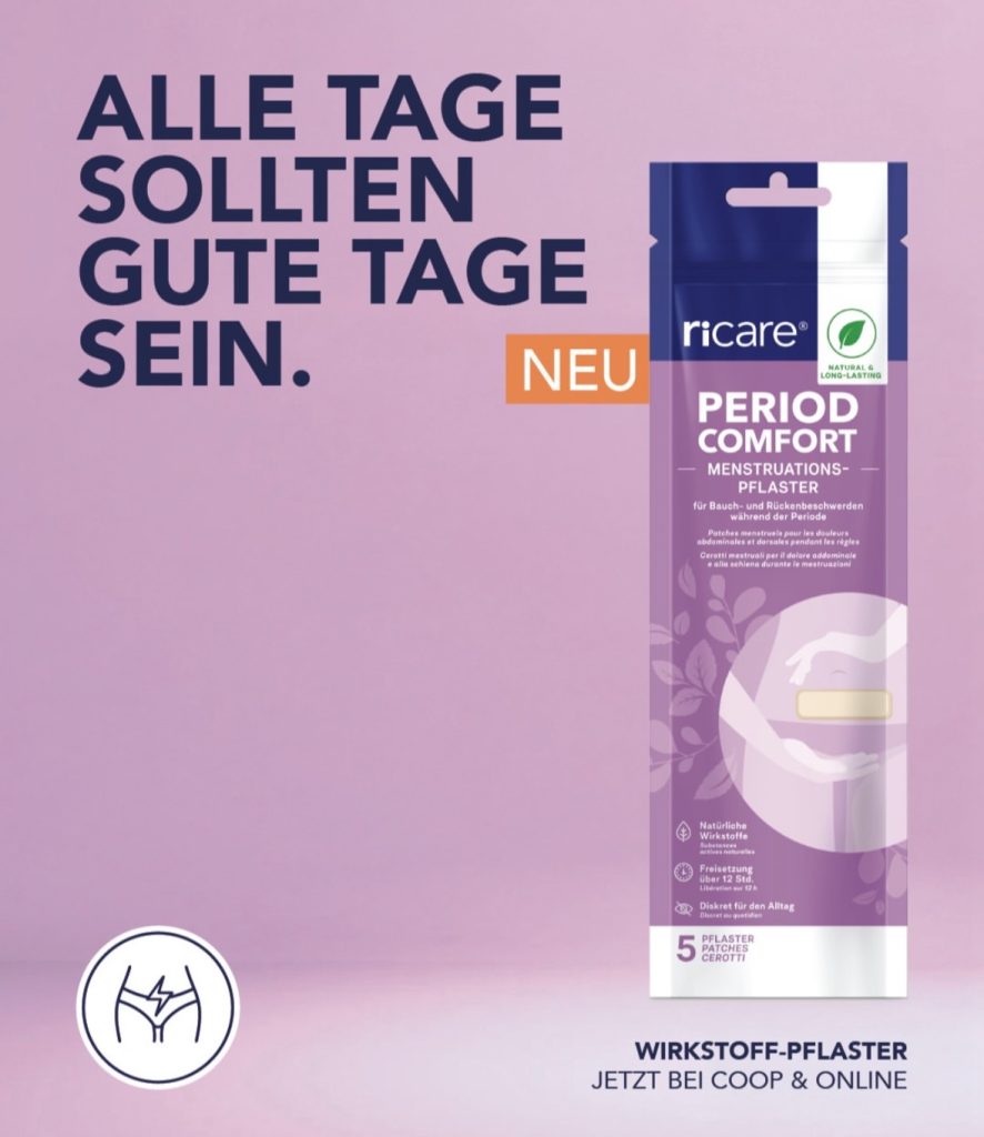 Auch während der Periode bietet ricare® sanfte Unterstützung: ricare® Period Comfort Pflaster lindern Krämpfe auf natürliche Weise. Auf Unterbauch oder Rücken geklebt, setzen sie Menthol- und Eukalyptuswirkstoffe bis zu 12 Stunden frei – angenehm kühlend, leicht prickelnd und schmerzlindernd. Anwenderin Whitney berichtet: «Eine echte Hilfe während der Periode. Und eine schöne Alternative ohne Medikamente, die einfach anzuwenden und wirksam ist.»