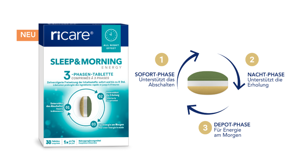 Die ricare® Sleep & Morning Energy Tablette ist ideal für alle, die nachts abschalten und morgens voller Energie durchstarten wollen. Dank der abgestuften 3-Phasen-Freisetzung begleitet sie jede Schlafphase optimal: