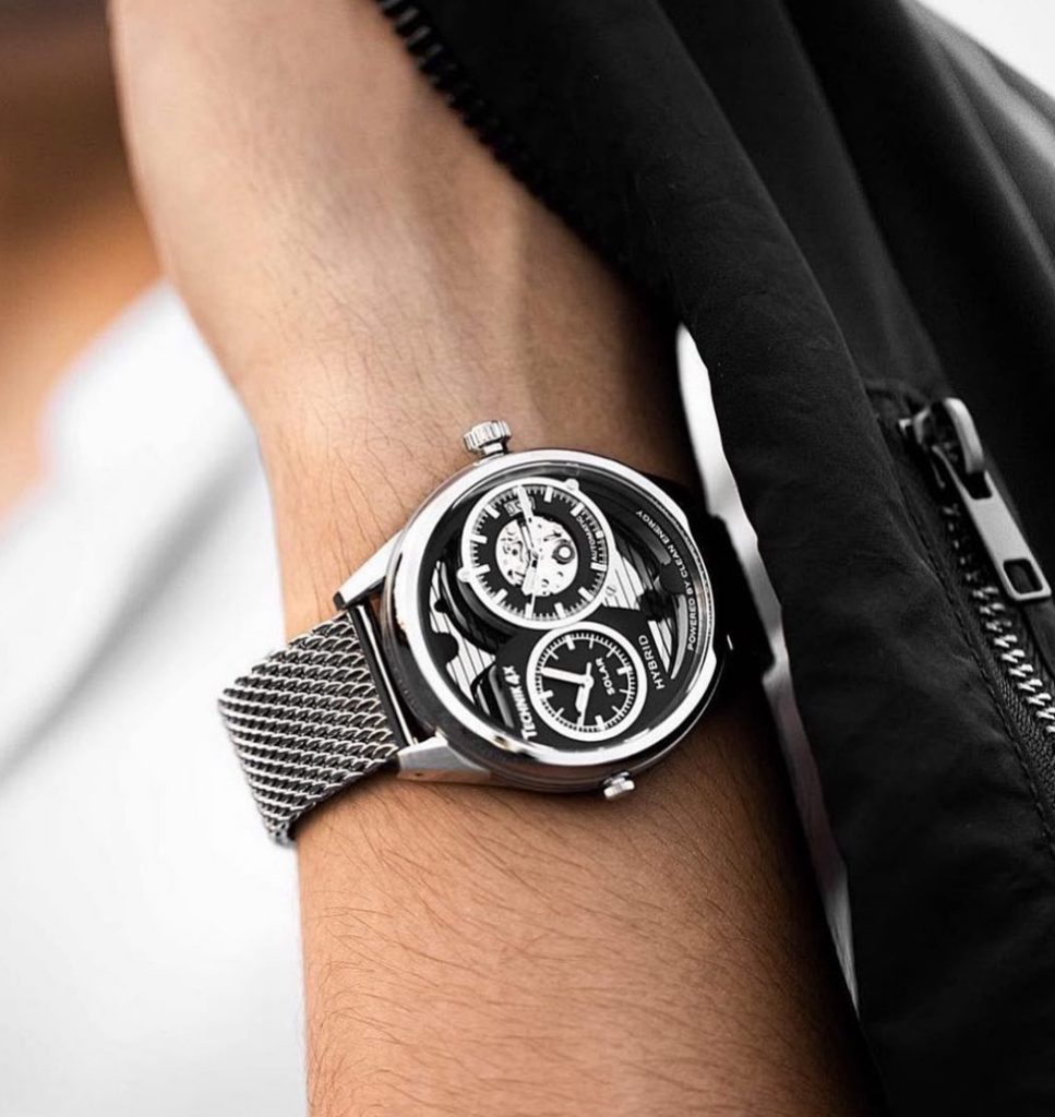 Umhüllt wird das einzigartige Zifferblatt von einem hochwertigen Saphirglas, das dank einer zehnfachen Antireflex-Beschichtung für maximal klare Sicht auf die beiden separat funktionierenden Uhrwerke sorgt. Zum einen ist dies ein automatisches Sellita-Kaliber mit Datumsanzeige, das durch Armbewegungen angetrieben wird, zum anderen ein ETA-Quarzwerk mit besonders geringem Stromverbrauch. Die theoretische Batterielaufzeit beträgt dabei bis zu 11 Jahre.