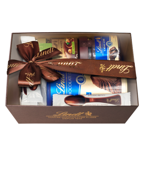 Für Wohlfühlmomente an kalten Tagen: Eine schicke Wollmütze (von Colmar via Zalando, CHF 50.–) und ein süsses Set von Lindt mit Leckereien für heisse Schokolade (Preis: CHF 34.95).