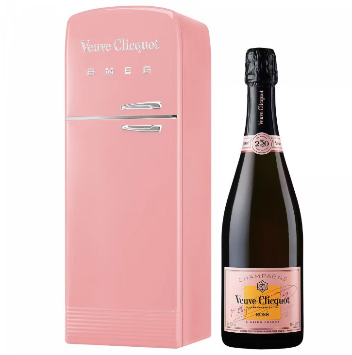 Heiss begehrt: Der Veuve Cilicquot Rosé wird hier anlässlich des 250-jährigen Jubiläums in einem kultigen Smeg-Mini-Kühlschrank in Rosé überreicht, der die Flasche für 2 Stunden kühl hält. Preis: CHF 93.95