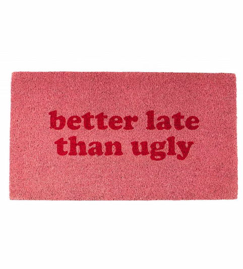 Kommt die zu Beschenkende regelmässig zu spät zu Verabredungen? Dann ist diese witzige Fussmatte «Lieber zu spät als hässlich, CHF 29.95) das perfekte Präsent für sie. Komplettiert kann es beispielsweise mit einem Bestseller-Lippenstift-Set (von Kylie via manor.ch, CHF 42.95).