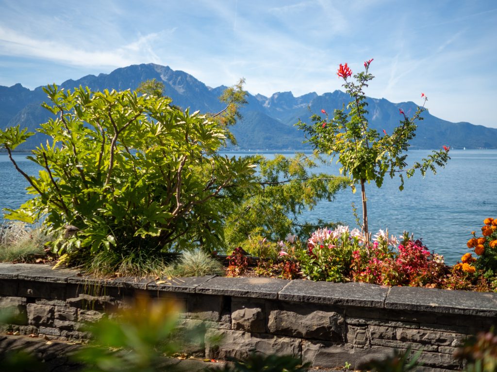 Die lange Uferpromenade wirkt wie ein Band, das Montreux zusammenhält und zugleich öffnet, denn Palmen, Blumeninseln und kunstvolle Skulpturen verschmelzen mit dem hell schimmernden Wasser des Genfersees zu einer Szenerie, die fast filmreif anmutet. SpaziergängerInnen bewegen sich an kleinen Badezugängen entlang, während Cafés und Bars ihre Terrassen ausbreiten und eine entspannte Riviera erzeugen, die in ihrer Kombination aus Duft, Farbe und Licht besonders eindrucksvoll wirkt.