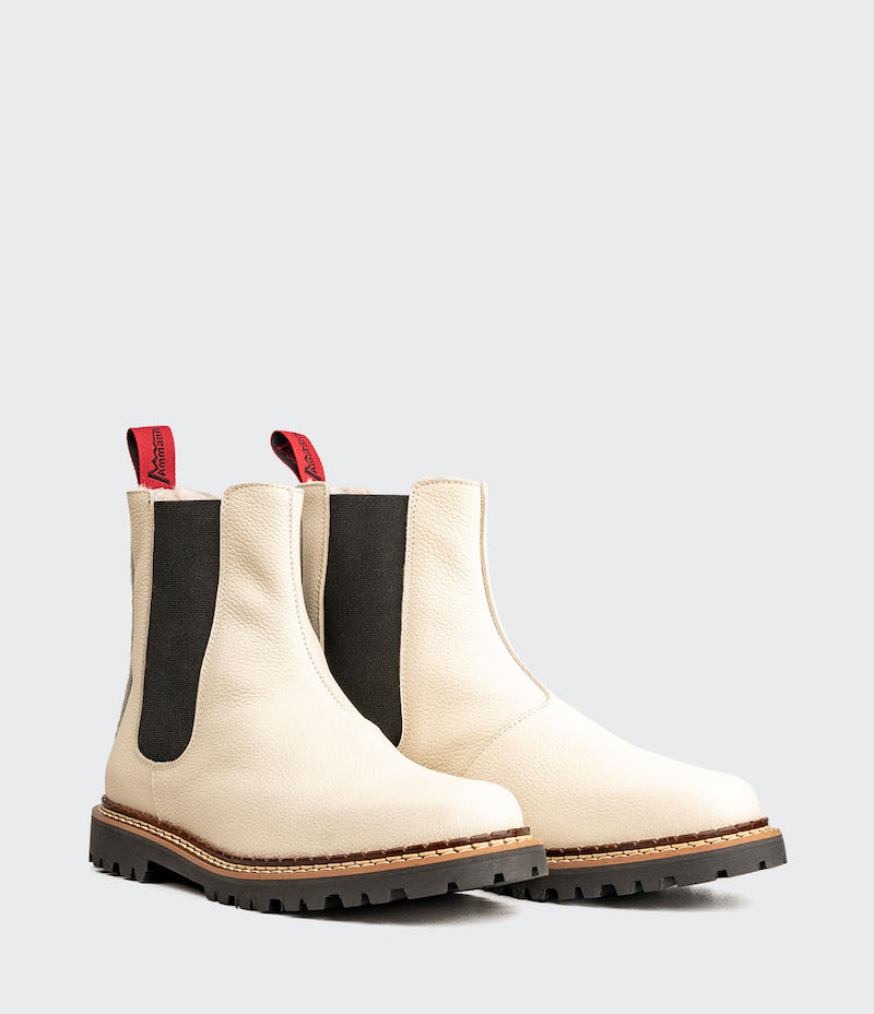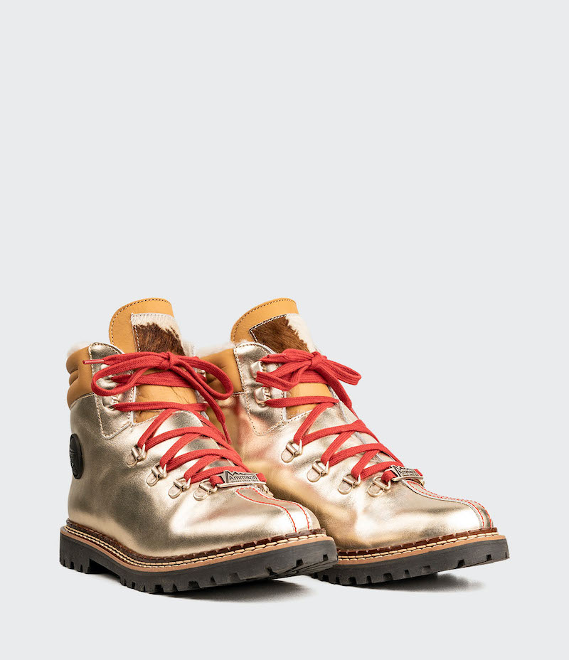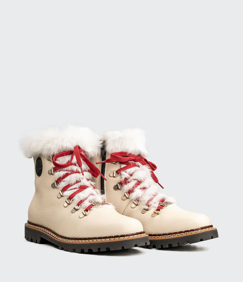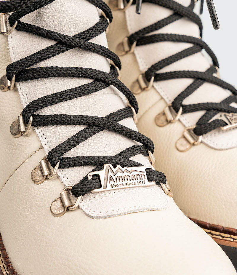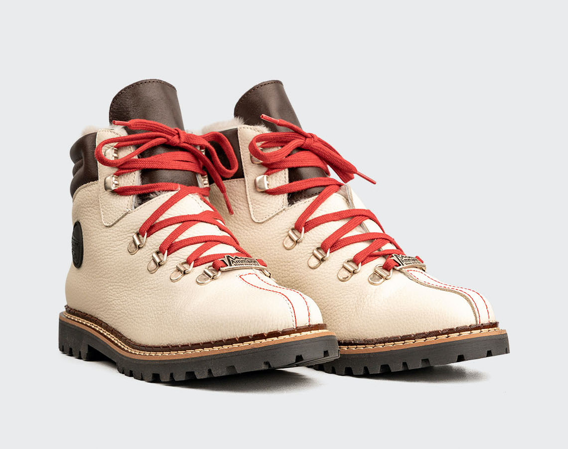 Der Splügen-Boot ist die sanfte, warme Geste der Linie. Ein Wohlfühlstück in Ecru-Leder oder Fell – weich, verlässlich, harmonisch. Ein Modell, das man morgens anzieht und abends kaum wieder ausziehen möchte. Zeitlos und modern zugleich, ohne seine alpine Seele zu verlieren.
