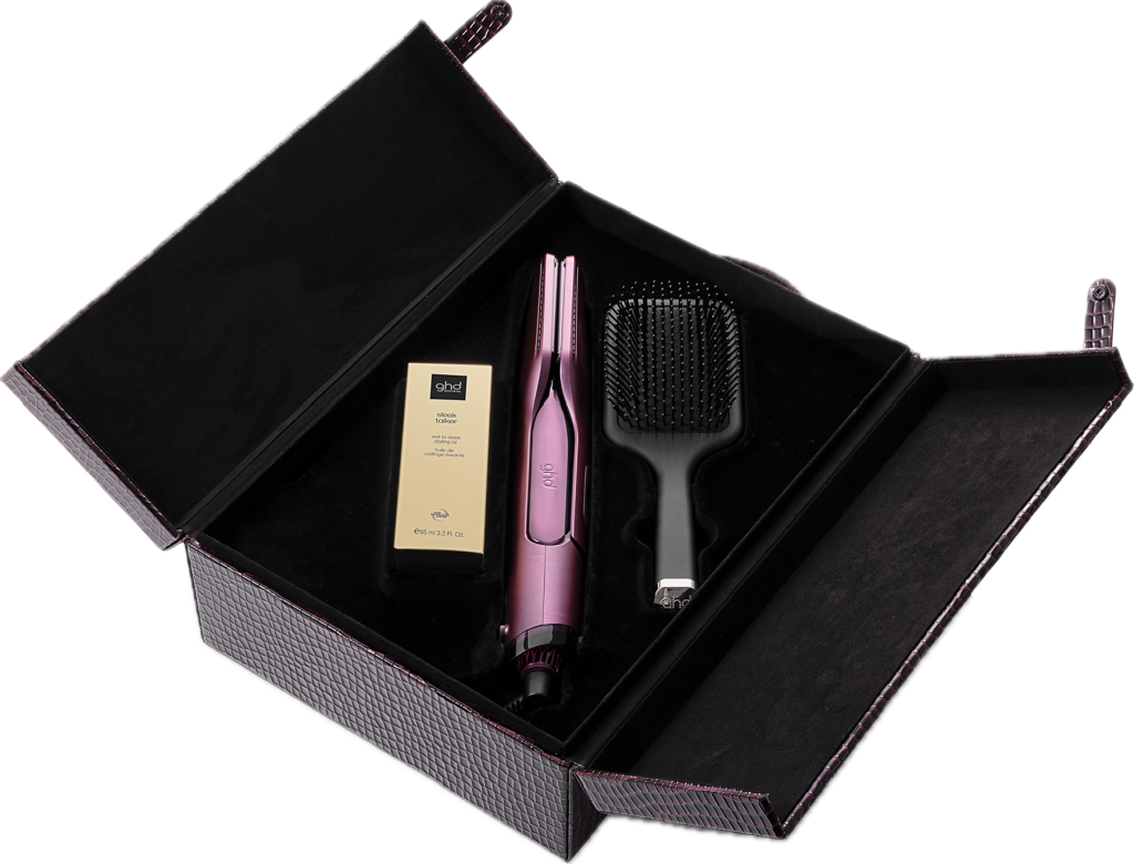 Dieses Set ist das Herzstück der Cherry Chic Collection. Es vereint den ghd chronos™ Styler (ghd’s neueste Glätteisen-Ikone mit HD Motion-Responsive™ Technologie) mit dem leistungsstarken ghd helios® Haartrockner – alles eingebettet in ein luxuriöses Case in Kirschrot mit Krokodilprägung. Die Kombination verspricht Salon-Qualität zu Hause: glattes, glänzendes Haar in einem Zug, Volumen und Definition beim Föhnen. (UVP CHF 539.–)