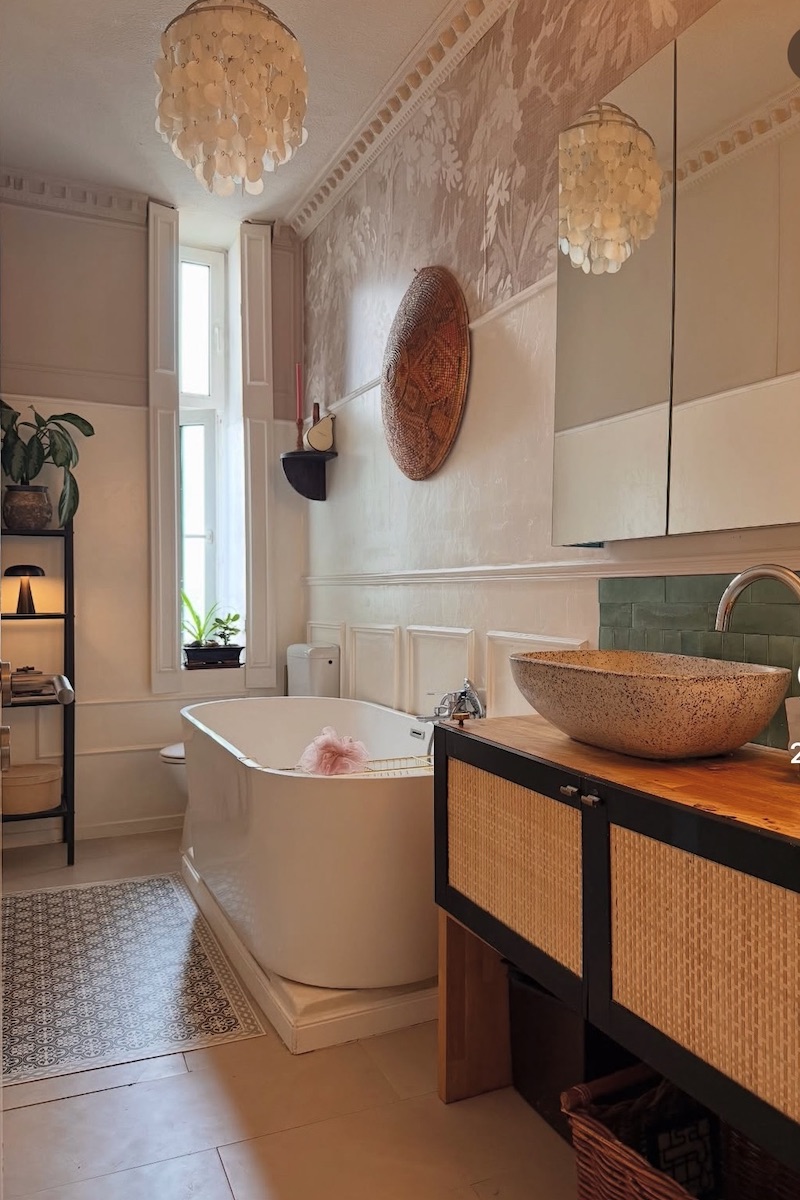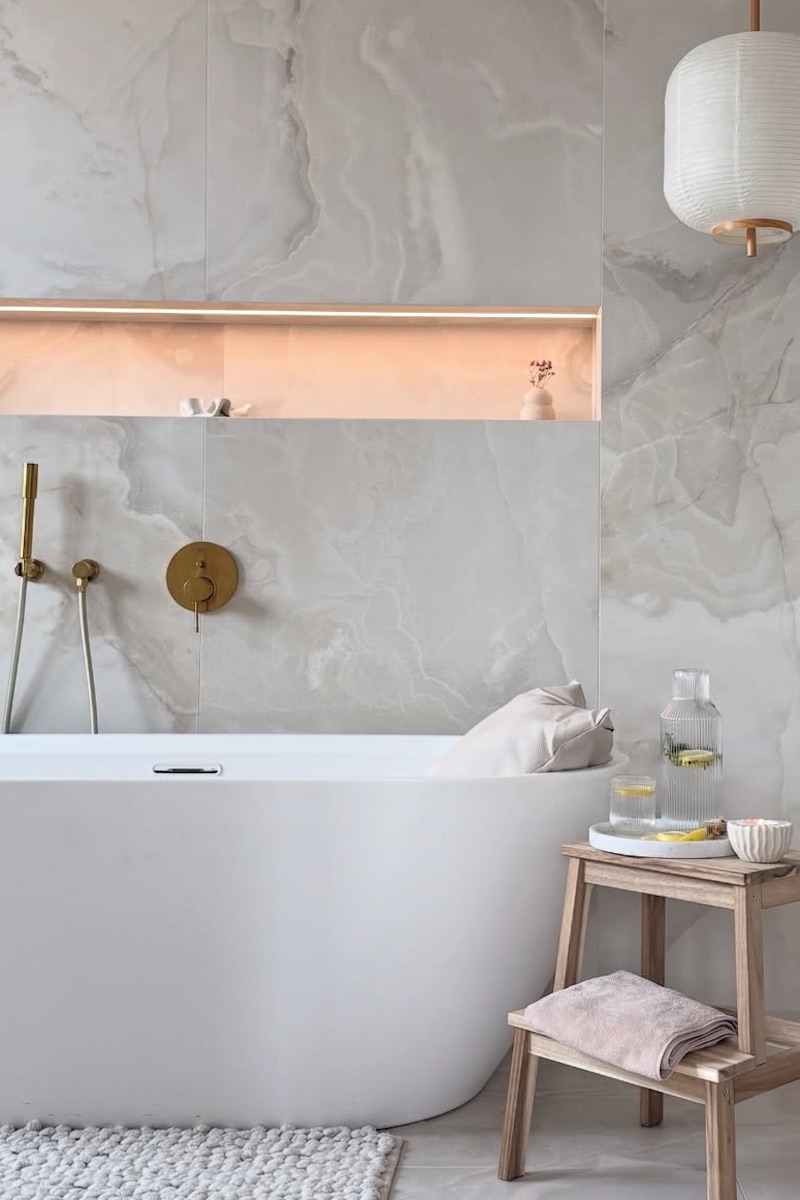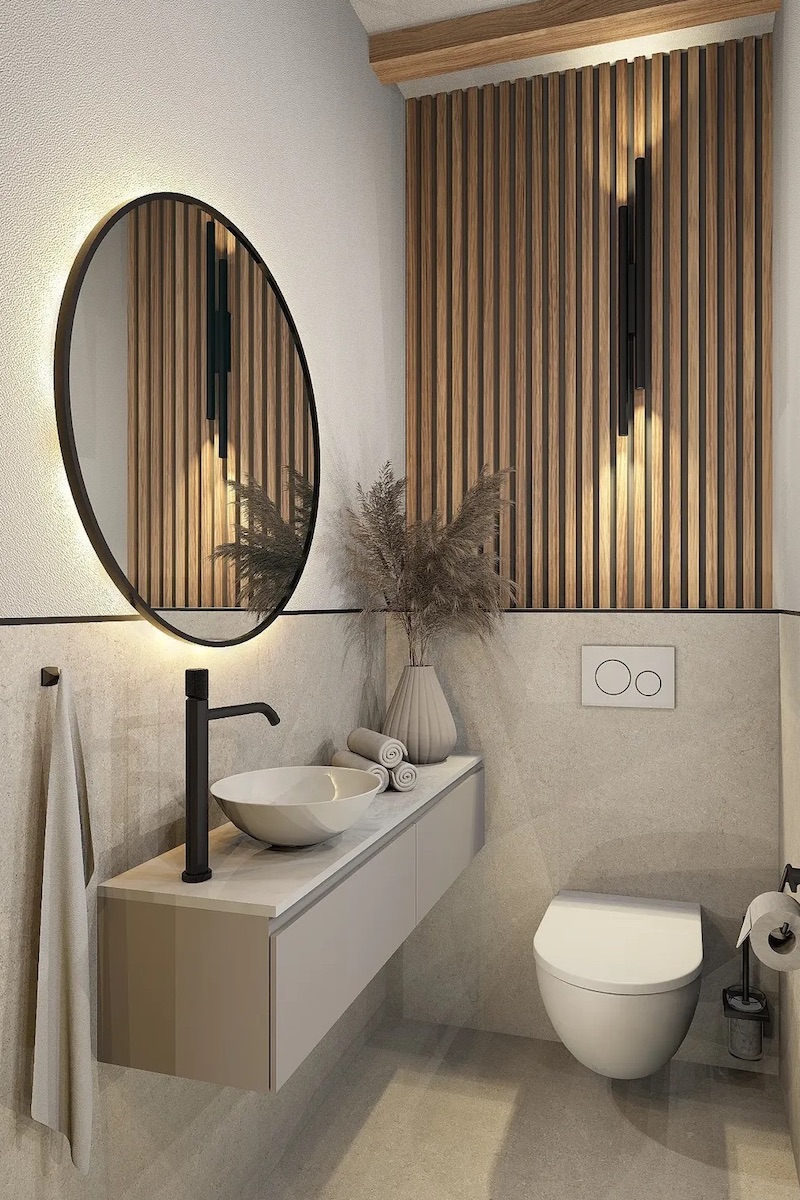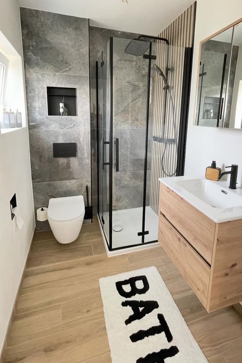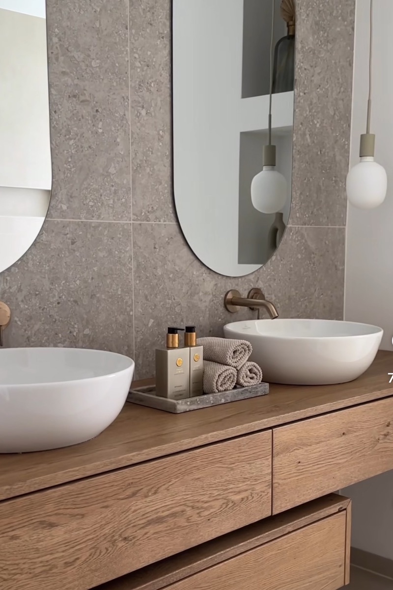 Unser Extra-Tipp: Kombiniere natürliche Materialien mit glänzenden Oberflächen, wie zum Beispiel Bambusregale neben Marmor-Ablagen oder Holzaccessoires neben einem Metall-Waschbecken. Das Spiel aus warmen und kühlen Elementen schafft Tiefe, Spannung und ein luxuriöses Wohlfühlambiente.