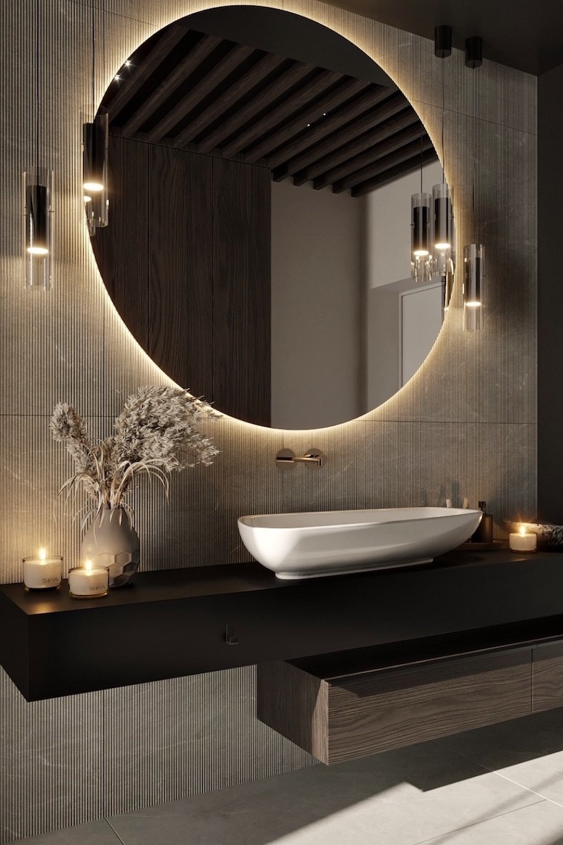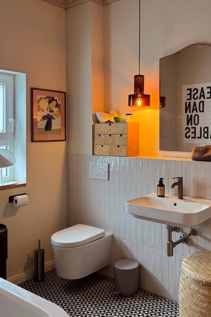 Nichts verändert die Stimmung in einem Raum so sehr wie Licht. Statt grellem Deckenstrahler solltest du deshalb in deinem Badezimmer lieber mehrere Lichtquellen kombinieren: Ein dimmbares Hauptlicht, sanftes indirektes Licht hinter dem Spiegel und vielleicht eine kleine Duftkerze auf einer Ablage. Warmweiss statt Kaltweiss ist hier übrigens zu bevorzugen. Denn das warme Licht schmeichelt nicht nur dem Teint, sondern auch der Seele.