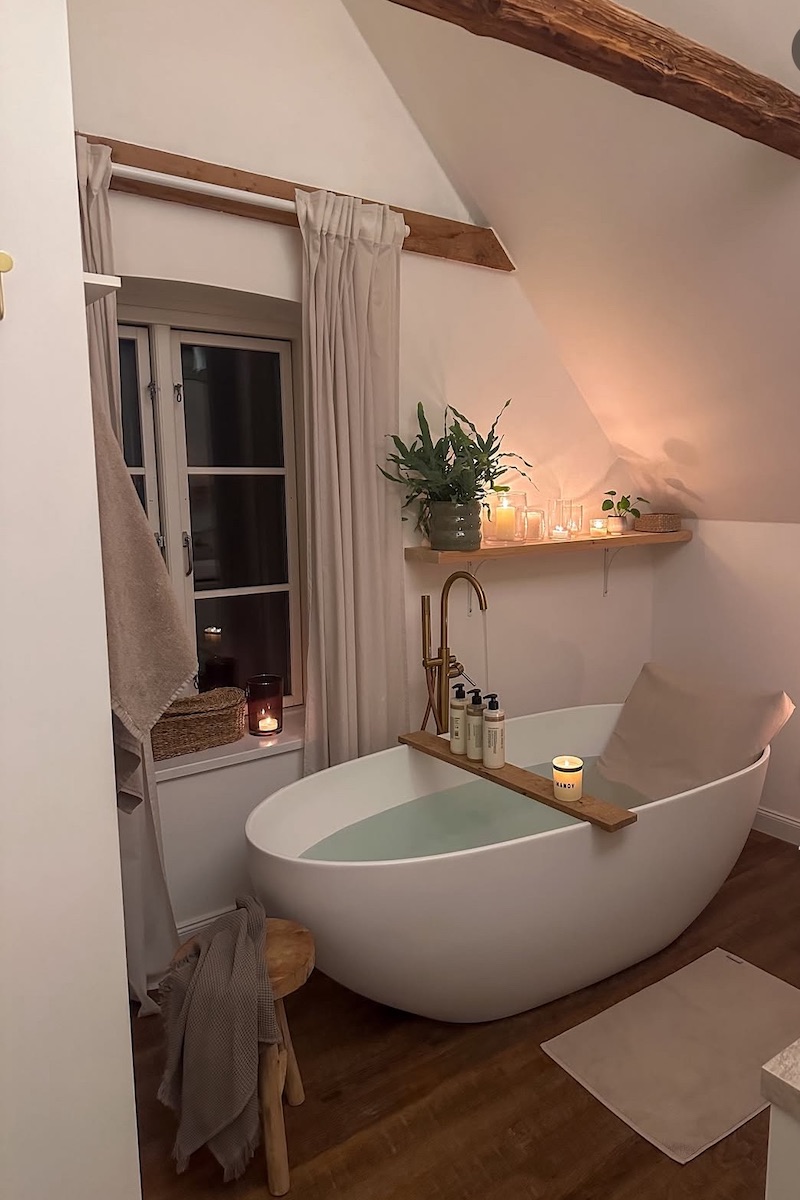 Unser Extra-Tipp: Eine kleine Vase mit Eukalyptus oder Kräutern macht optisch etwas her und verströmt gleichzeitig während des Badens einen subtilen, natürlichen Duft, der sich im Dampf sanft entfaltet. Kombiniert mit gedämpftem Licht und flauschigen Handtüchern entsteht so ein kleines Spa-Erlebnis direkt zu Hause.