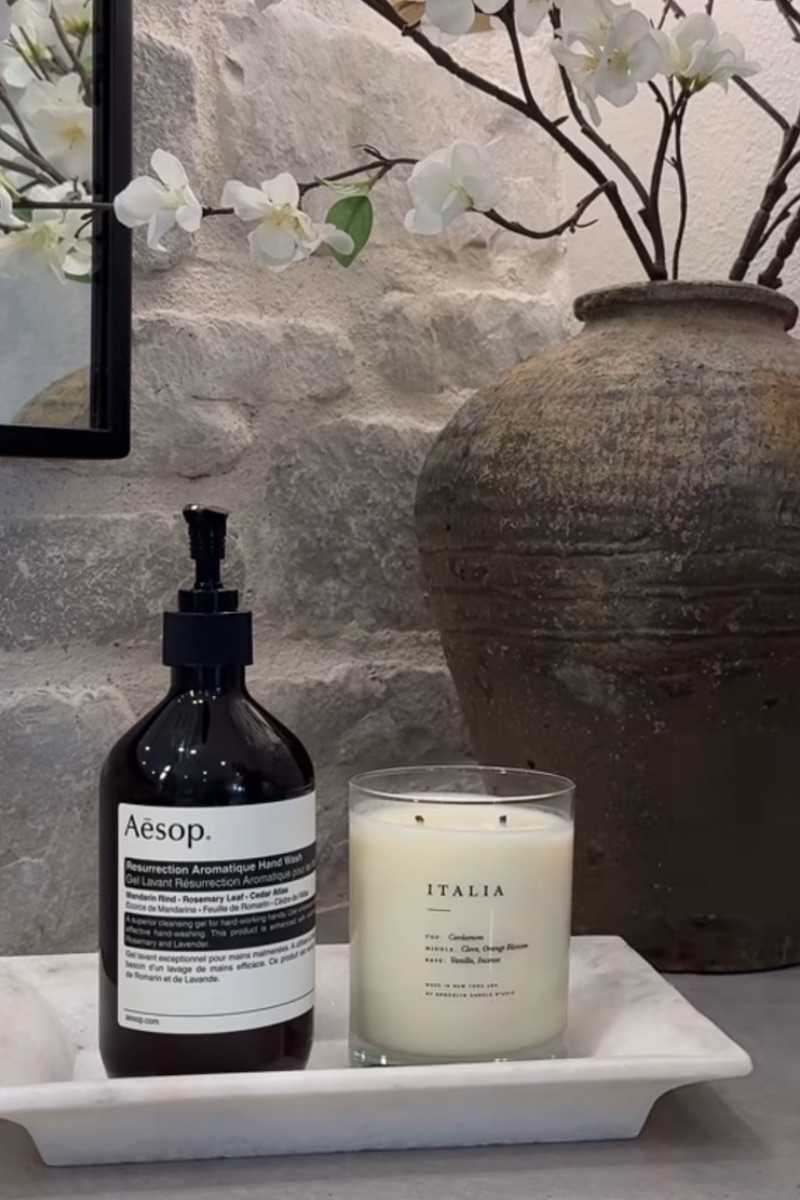 Geruch ist der direkteste Weg zu Emotionen. Ein feiner Raumduft kann dein Badezimmer augenblicklich in ein Mini-Spa verwandeln. Setze dabei auf Düfte, die beruhigen. Sandelholz, Bergamotte, Weisser Tee oder Lavendel sind Klassiker. Wer Lust auf saisonale Akzente hat, kann den Duft natürlich auch variieren: Zimt, Vanille oder Kiefer bringen im Winter Wärme und Geborgenheit, während frische Zitrusnoten im Frühling und Sommer für Leichtigkeit und Frische sorgen.