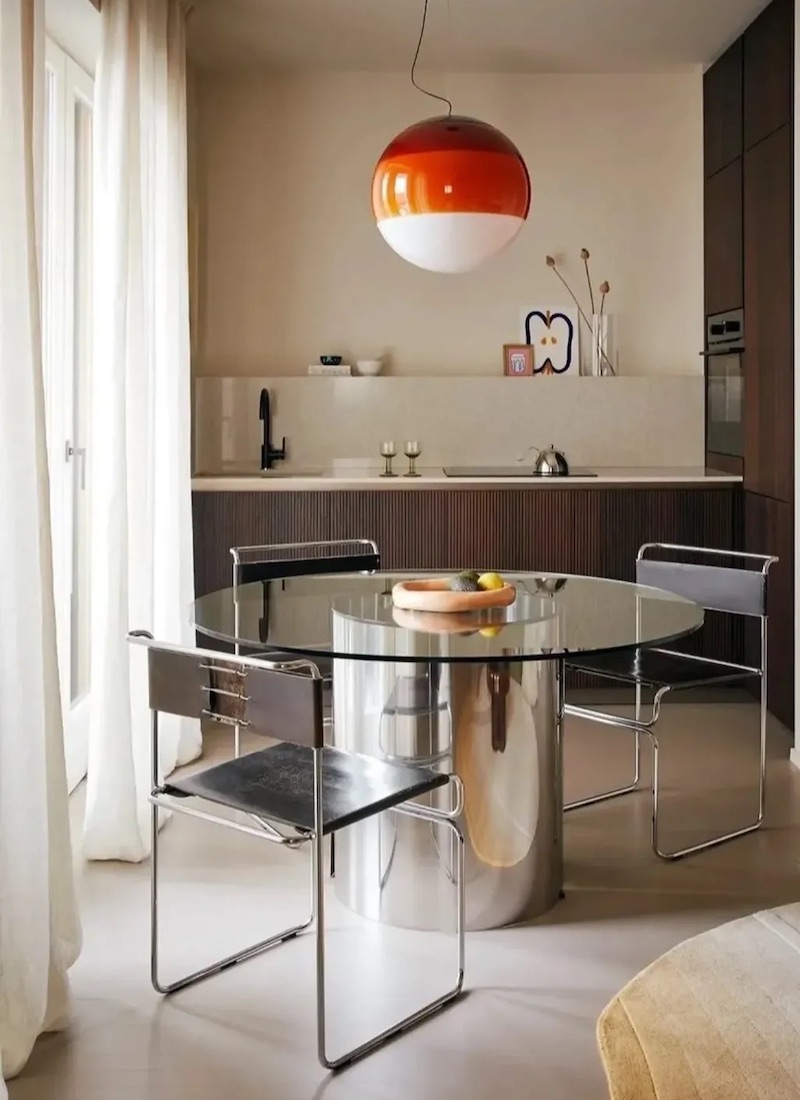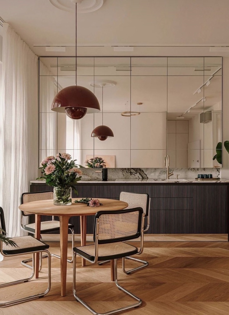 Besonders wirkungsvoll ist der Kontrast zu natürlichen oder strukturierten Materialien: Ein Messingtisch vor einer rohen Betonwand, ein glänzender Spiegelrahmen neben grob gewebtem Leinen oder Glasvasen auf einem handgefertigten Holztisch schaffen Dynamik in einem Raum. Reflektierende Oberflächen sind so nicht nur dekorativ, sondern werden zu einem aktiven Gestaltungselement, das Räume leichter, offener und zugleich luxuriös wirken lässt.
